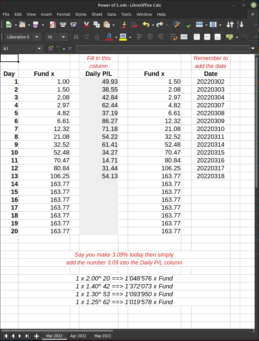10519100% Per Day is a big target, however, what you have done is still a huge result. I don't know or care what capital you are starting with but with just $1,000 it looks like this.xard777 wrote: Sun Mar 20, 2022 12:27 am My posts will be few and far between as I spend most of my time trading during the weekdays and family time at the weekends.