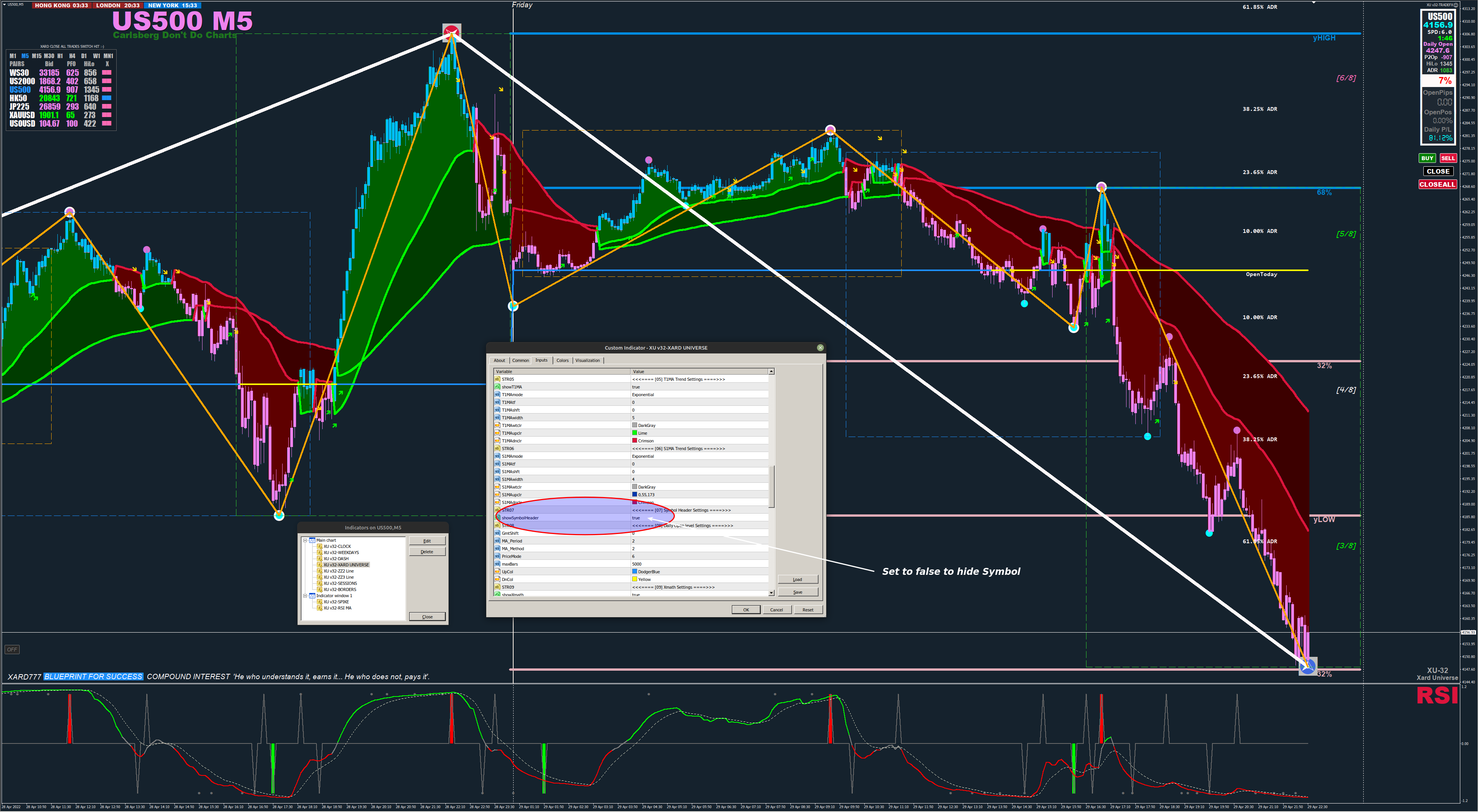 Regarding the RSi, I have added a simple RSI-coloured text (top-right of sub-window) showing when the RSI is above (Blue) trending UP, below (Red) trending down, and (Grey) in between.