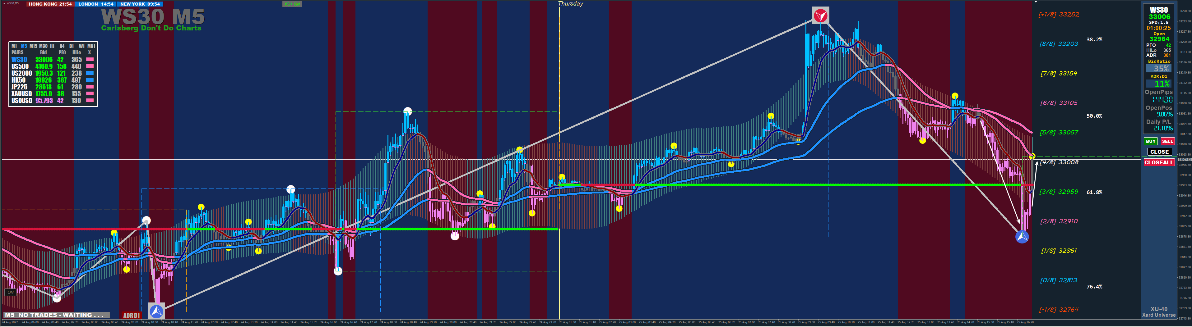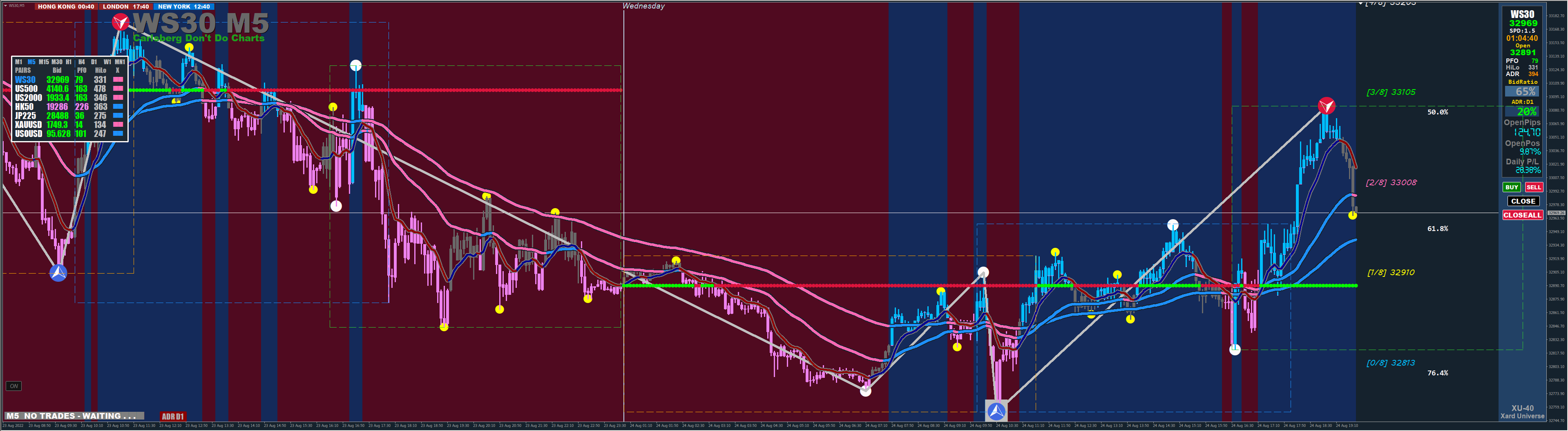XARD: It is nice to have both TFs in sync but there are always trades available, the 5min TF is colour coded; Price below the Daily Open and Pink Candles... consider SELLS, Price Above the Daily Open and Blue Candles... consider BUYS.