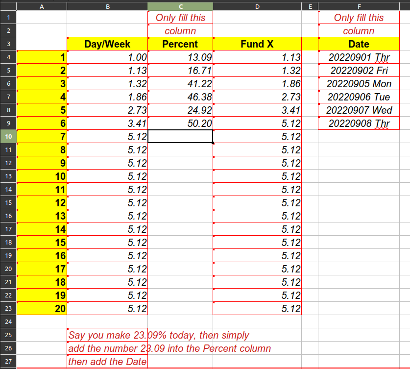 I updated my spreadsheet, you can see the Fund X compound figure starting to take off as we accumulate the trades.