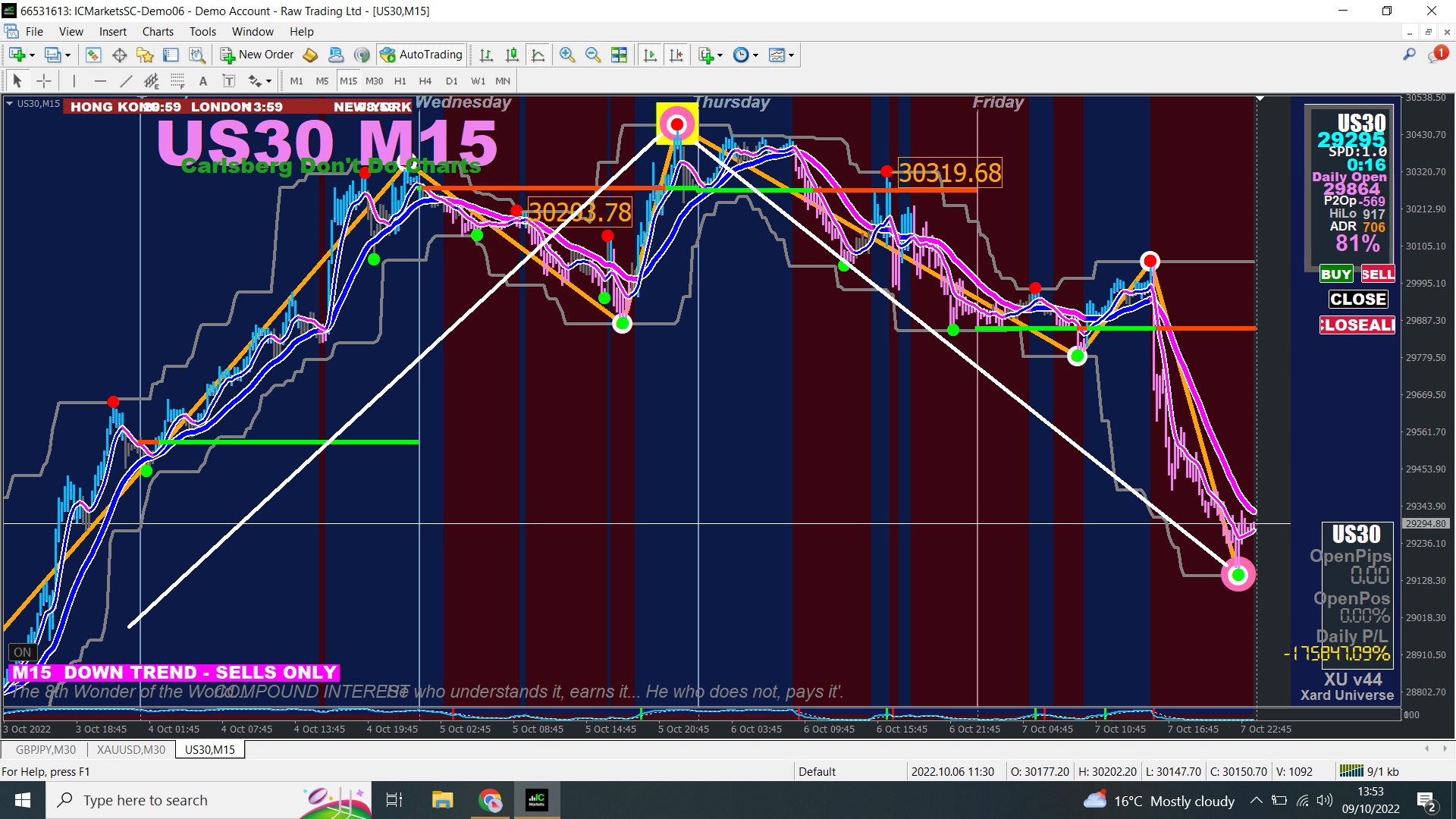 Regarding compounding:- I set myself a daily target and try to hit that target every day so if say my daily target is 6% then over a month which is 20 trading days I would want to compound my daily trades at 6% so my Fund would be 1 x 1.06 ^ 20 = 3.21 times my original fund. Having done that I would then look at ways to increase my daily target say from 6% to 8% so my Fund would be 1 x 1.08 ^ 20 = 4.66 times my original fund ( a couple of percentage points can make a big difference). One of the reasons that I trade Indices is because of their daily movement (in excess of 400, 500, & 600 Pips Hilo range which can be two to three times that in up and down movement during the trading day.) which makes it easier to hit and maintain my daily targets.