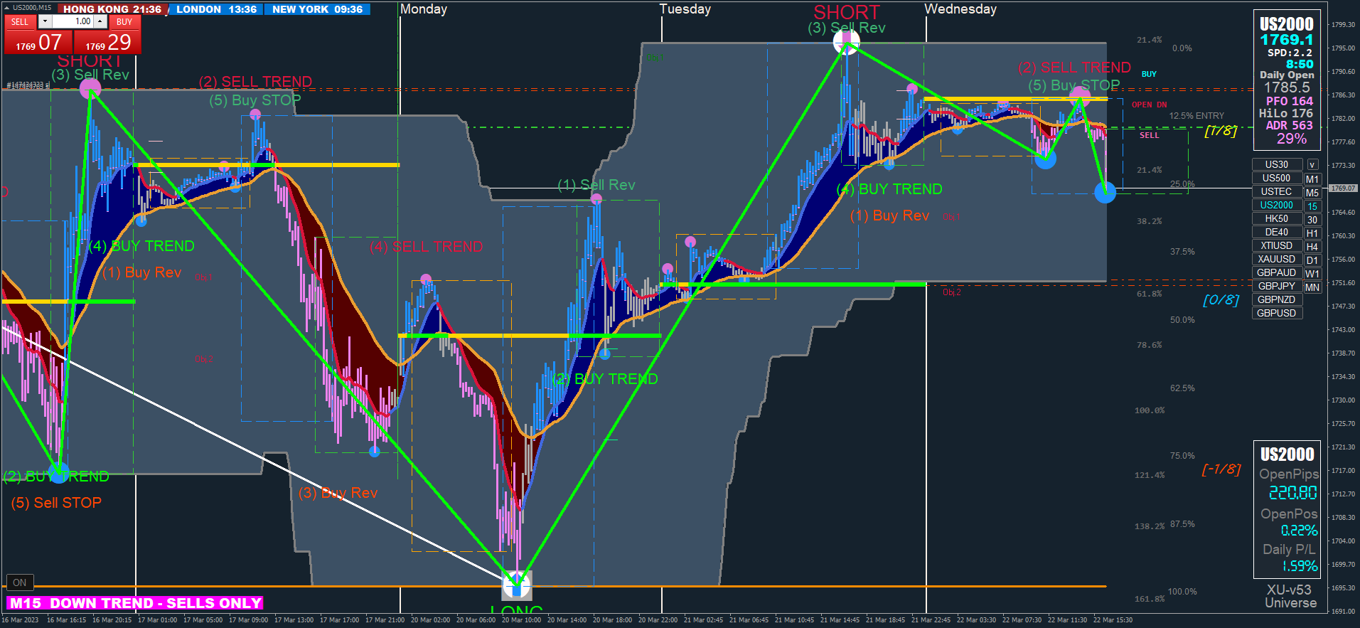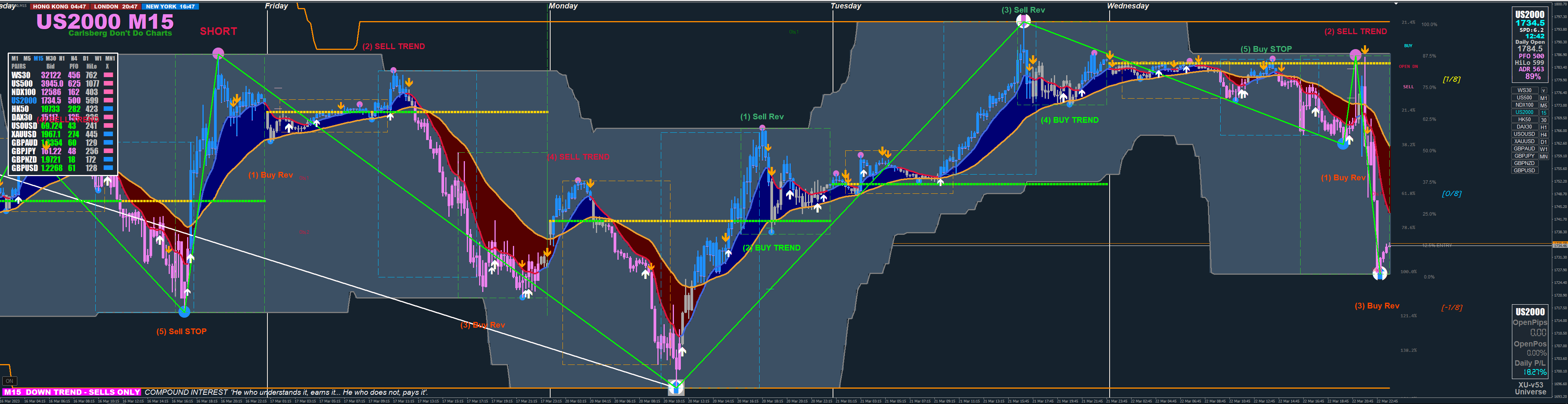 You want to use the Green Zigzag to trade off, but more to the point you want to concentrate on the White Dot (Pink/Blue Arrow), that should be your real BIAS on the 15min chart to trade away from. So if the White Dot (Pink/Blue Arrow) is say a TOP then you would look at SELL trades during the UK/US sessions when price crosses the T1MA line towards the channel line (inner channel for Green Zigzag line to Blue/Pink large Dots and outer channel line when price makes a new White Dot (Pink/Blue Arrow). Once you get your head around this easy move you will win hand over fist as you will be trading in the direction of the Trend.