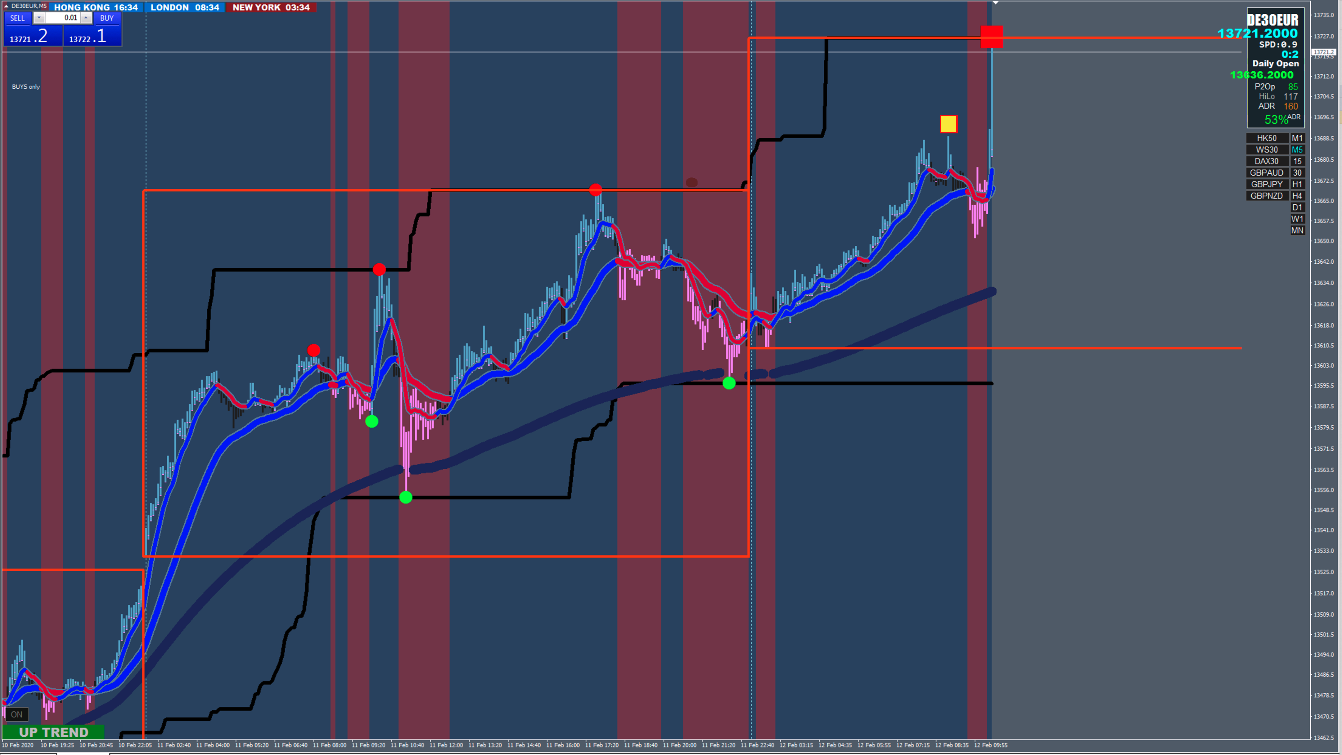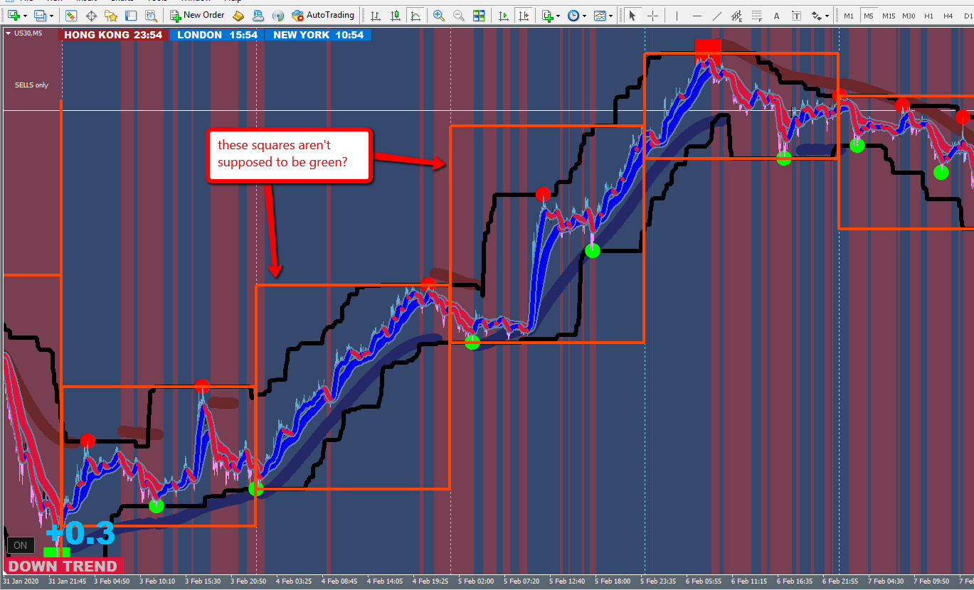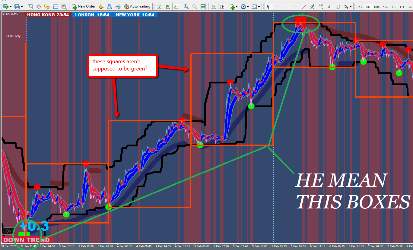 Red square means you should look for a downtrend, green box means you should be looking for an uptrend. The box will show up on the 5 min chart but it's created based on the 30 min chart.