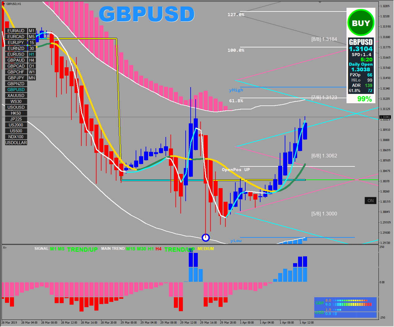 OK, we have two Inner (Aqua colour) and two Outer (HotPink colour) Weekly Channels synced to the Symbol’s ADR. We have a Murray Math that is synced to the 4hr TF (64) plus two TMA Channels (one hidden) giving us our Ribbon. We also have our Trend line and Price line including a CCI in the sub window all of which are providing “Visual Direction” from the 4Hr TF down to 1min TF and between them, we can discover new ways to make Pip$.