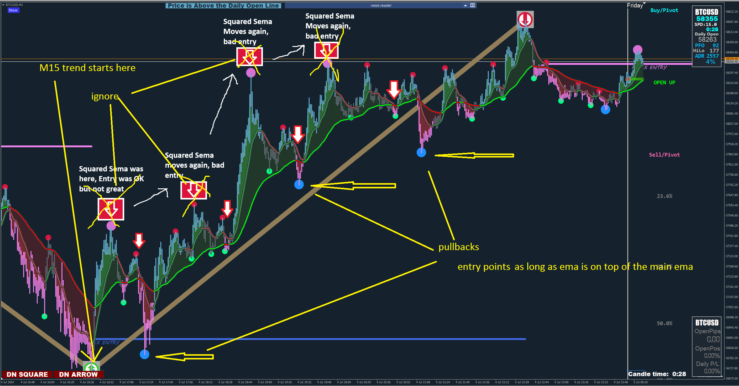 Currently I ignore the big semaphores and focus on the trend on the M15 chart and look for entry points on the M1 chart in the form of mini dots and it actually works quite well.