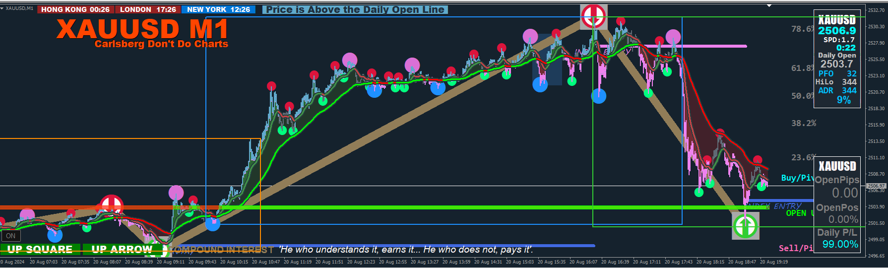 The 13 and 55 period EMA Ribbon is from the Flying Dragon indicator. The red arrows are set to the lowest risk setting (indicates MA touch/cross).