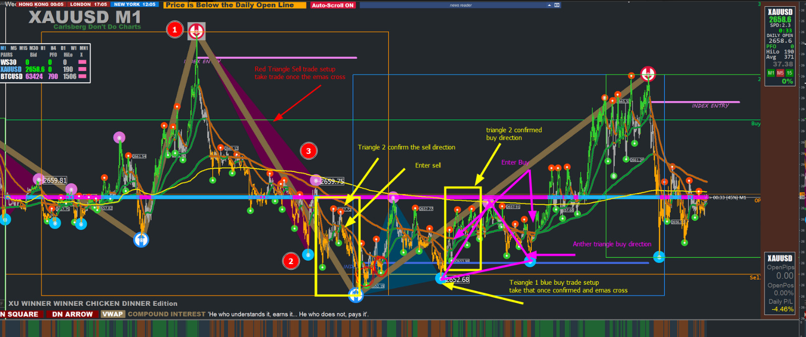 For example, when the big arrow or the smaller arrows (up or down) appear, I sometimes get confused. I understand that they might signal a change, but sometimes, for instance, when I see a big down arrow followed by an up arrow, and the price creates a lower low, the down arrow changes to pink and the triangle shifts back to a down direction.