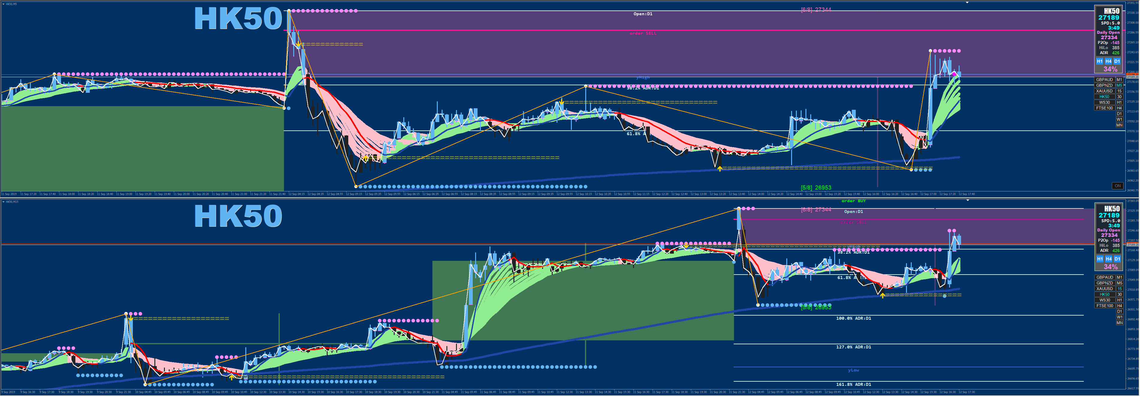 At this point we can see that Price has not only crossed back over the Signal line changing it to Blue again but also that Price is above the Daily Open line and has in fact crossed the order BUY line. Everything visually is screaming BUY BUY BUY (our Daily background Candle is now Green-BUY, our background Ribbon is now Green-BUY, and our Candles are now Blue-BUY).
