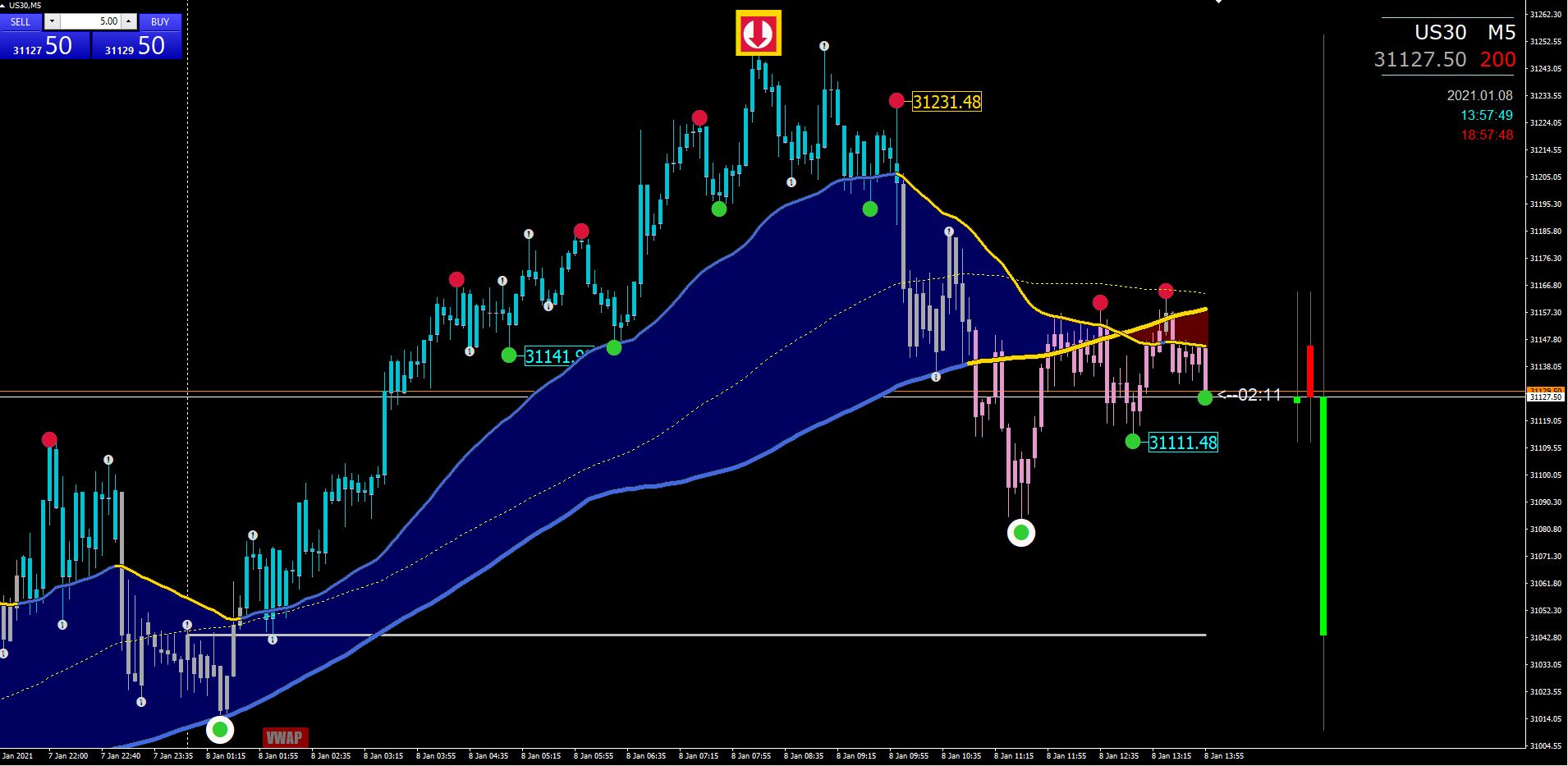 Big white Dots more or less coincide with SD levels. Thus we watch who wins the game and of course we have always the general direction of higher TF's in mind. That is also for Daytraders most important. Someone said, it's a Bull market (US30). Yes, we can see that. It means that my confidence in placing calls is higher, knowing that Puts are counter trades and may be short lived, but still make money.