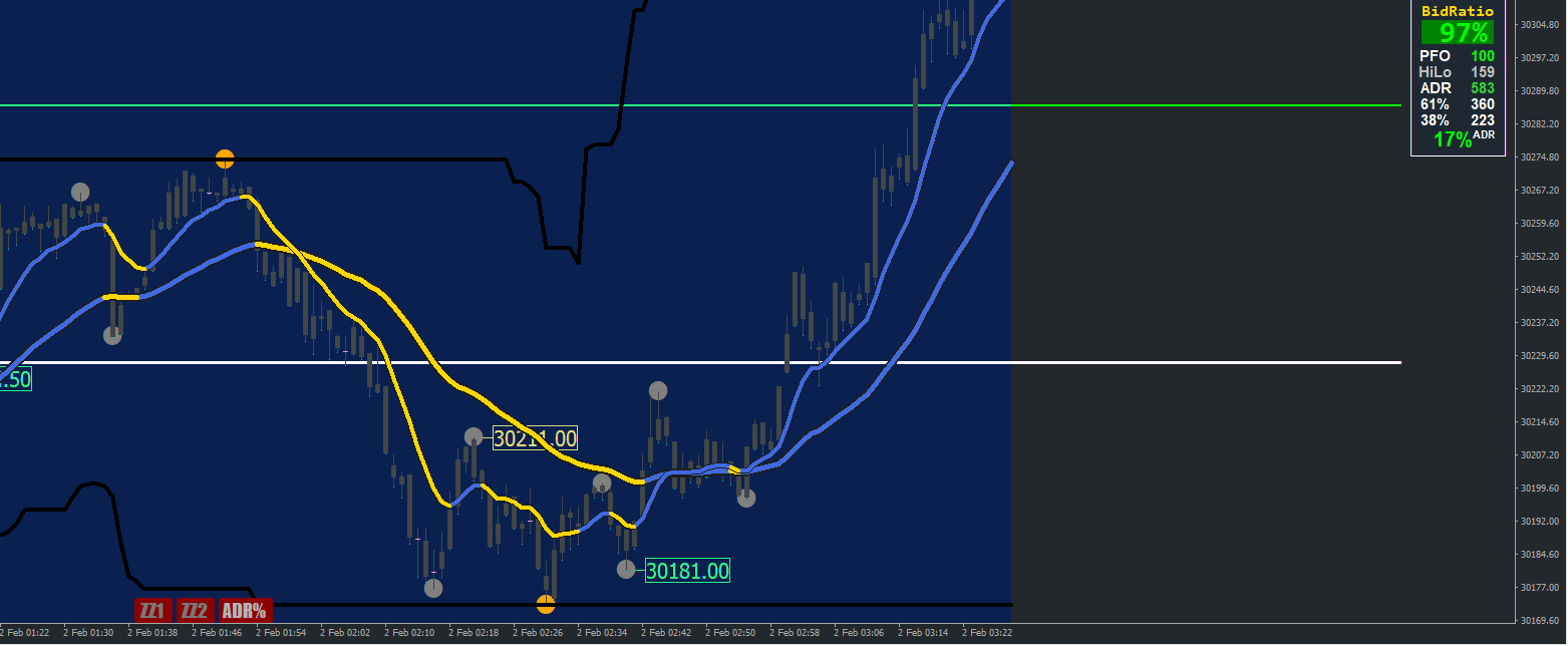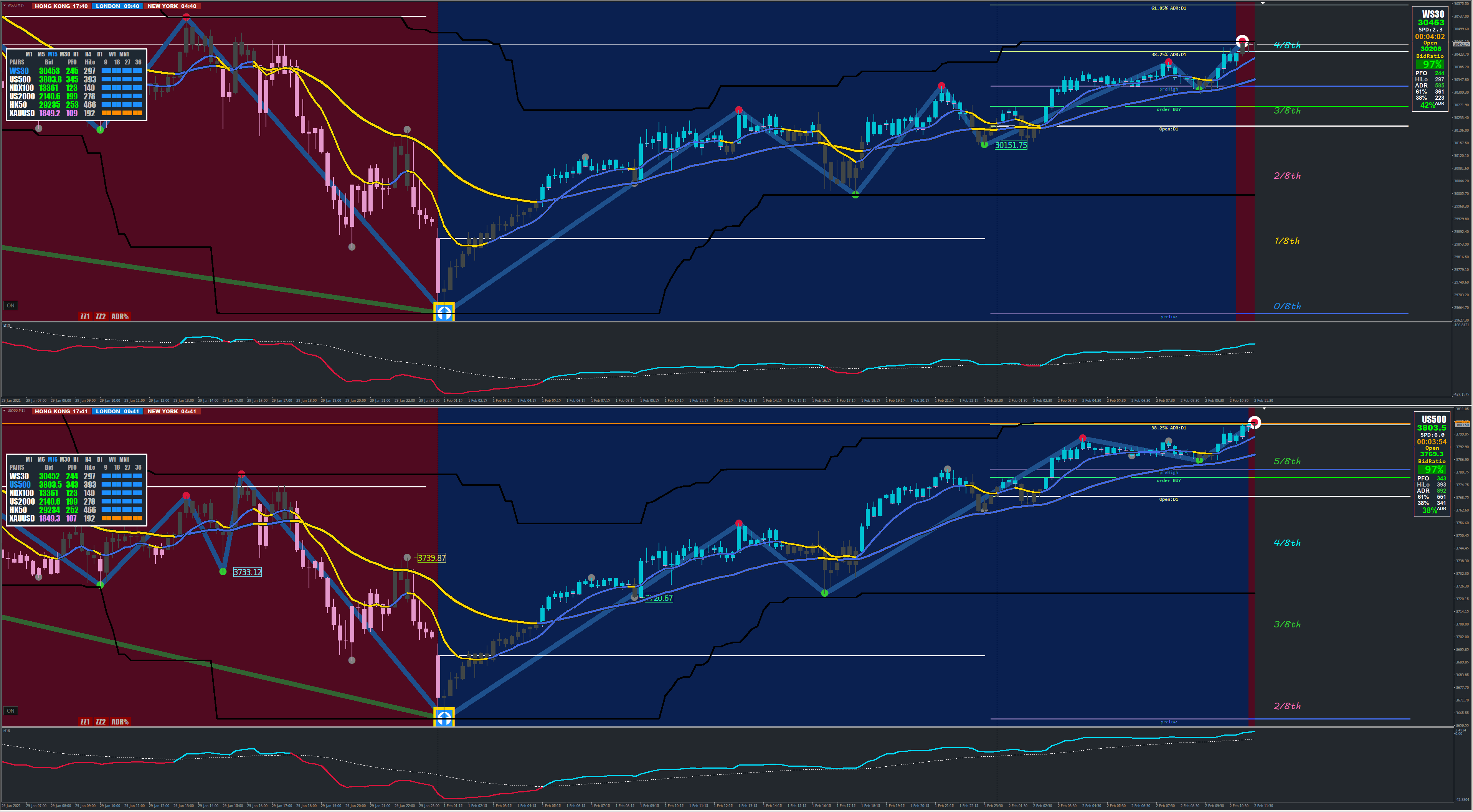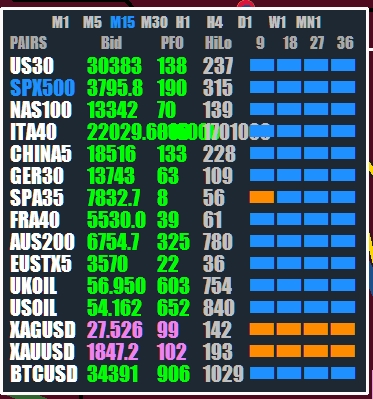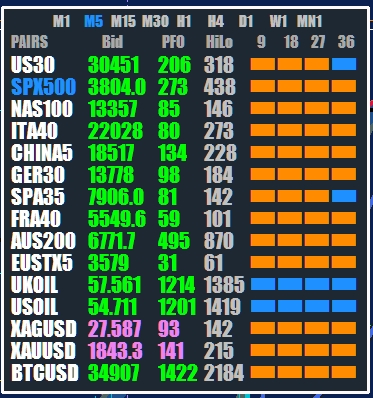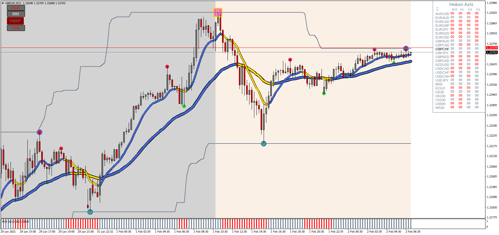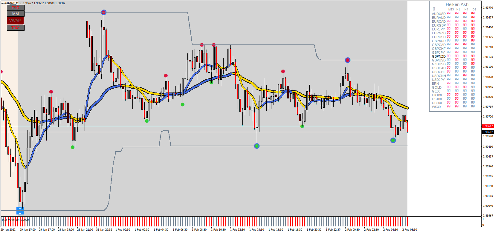 1m thru 30m in sync , if FX5 is running slow on your system then stay away from 1m TF.