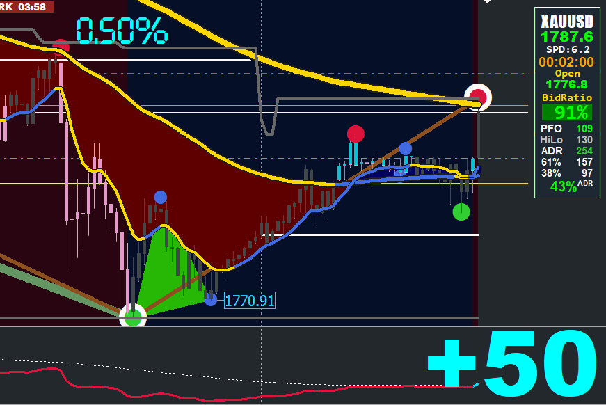 Apart from the 2nd Triangle on the current TF (no Dots), ALL Dots Triangles (with Dots), ZZ line, and Backgrounds displayed come from the next higher TF. This reduces waste and allows you to hone in on better turning points and give you decent moves in return.
