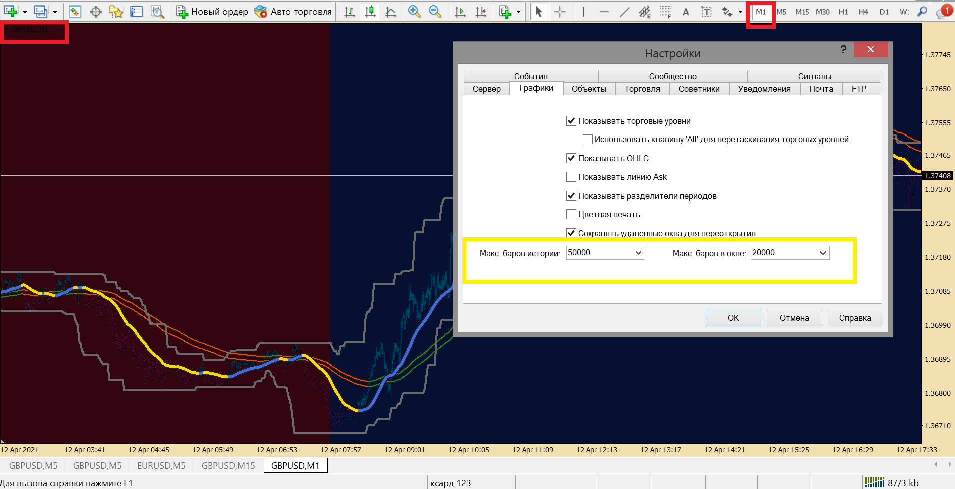 6888Скорее всего нужно добавить в настройках терминала Максимально баров в истории и максимально баров в окне.Mustafa wrote: Tue Apr 13, 2021 3:46 am Hello XARD.... on M1chart it shows only one background color, the dark blue.... is it normal. Why doesn't the background color change on 1 minute chart?