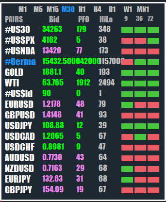 The problem I face (and many others I assume) is that CFDs of indices and commodities are not displayed correctly (see below dash picture for #Germany30 and #US$idx_M21 - for #Germany30 zero decimals should be shown, for #US$idx_M21 2 decimals, or 3 should be shown). One cannot provide for all the possible naming combinations used by brokers, so why not give the users the ability to define how many decimal places to be shown for each CFD? Currency pairs are displayed correctly so we are talking about the Index Pairs input of the indicator. How about creating another input field (let's name it 'Index Pairs decimals'), below the Index Pairs field, so that the user can define for each entry in the Index Pairs field, by inputting a comma separated array of values, how many decimals will be shown in the Bid column. From this value, the PFO and HiLo display can be adjusted automatically.