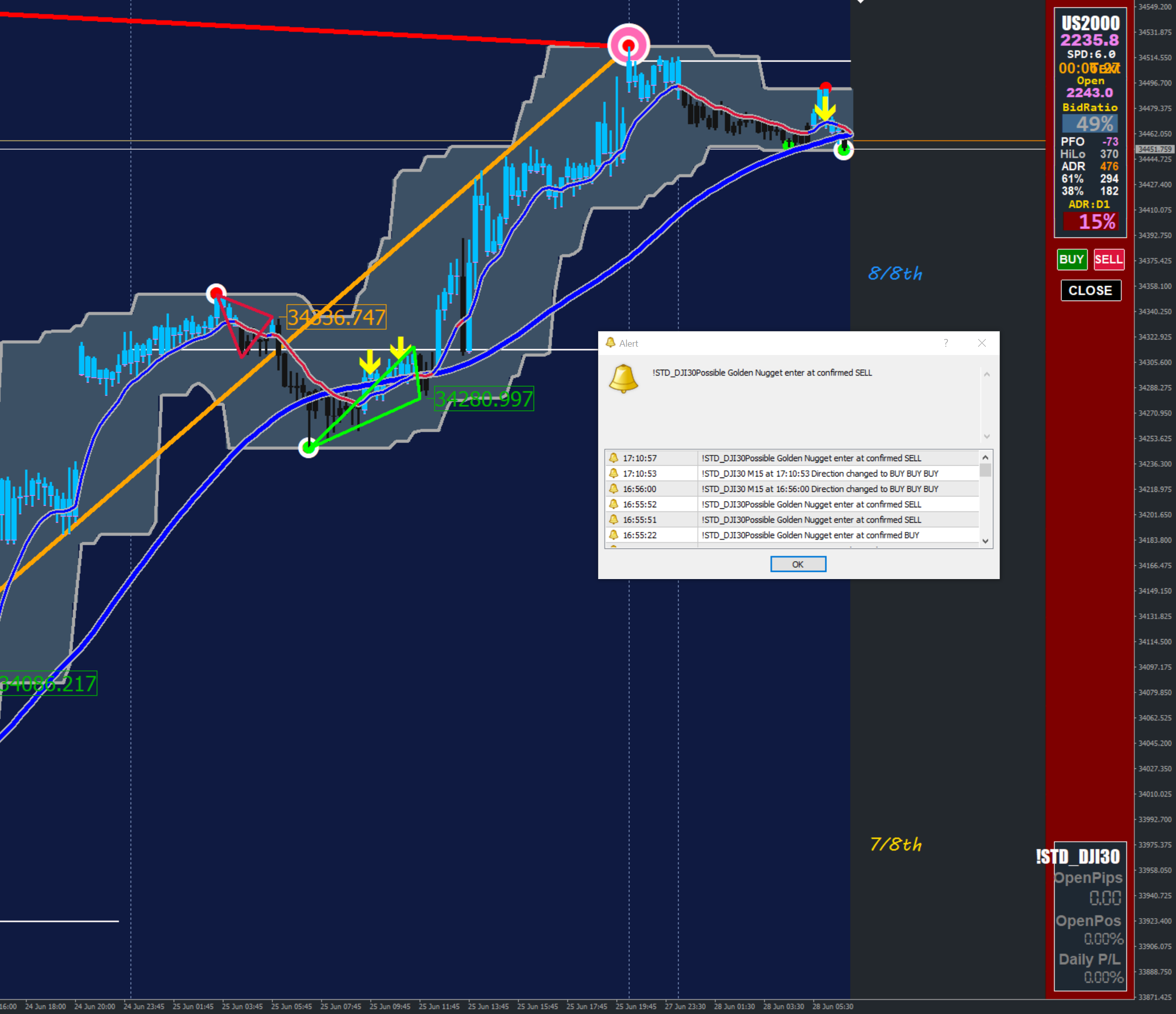 I have written this indicator to detect possible Golden Nuggets. It will give an alert on screen, email and notifications when a red dot occurs below the open line or a green dot above the open line as well as a big yellow arrow when the bar closes. You still need to wait for price to cross the EMA and the bars to change colour so don't just jump in when you see the yellow arrow.
