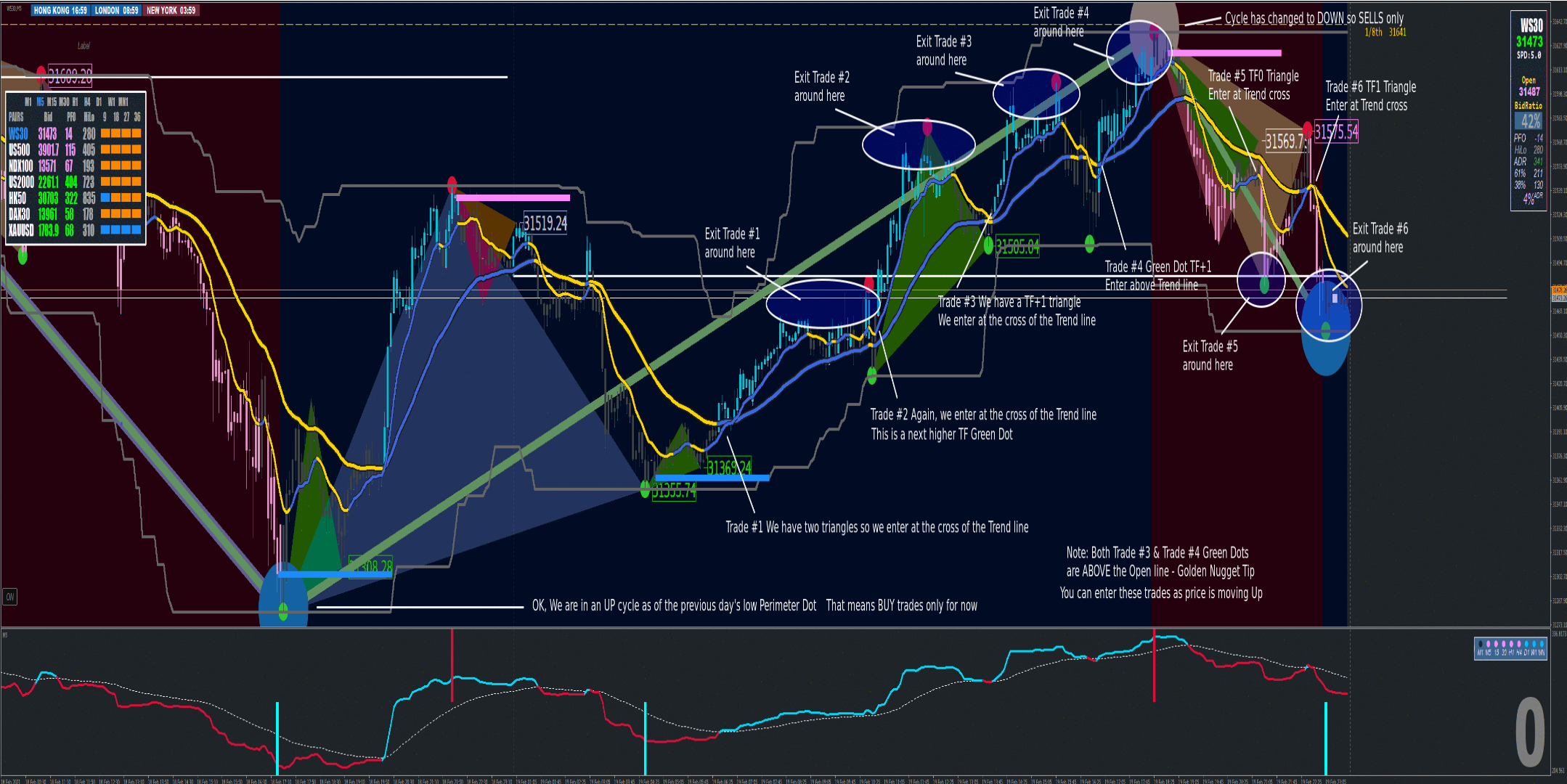 [*]Use the orange ZZ line (which always matches with your Perimeter dot) on 15m as your trading bias (this means the ZZ line shows you the overall trend which you should trade in line with).
