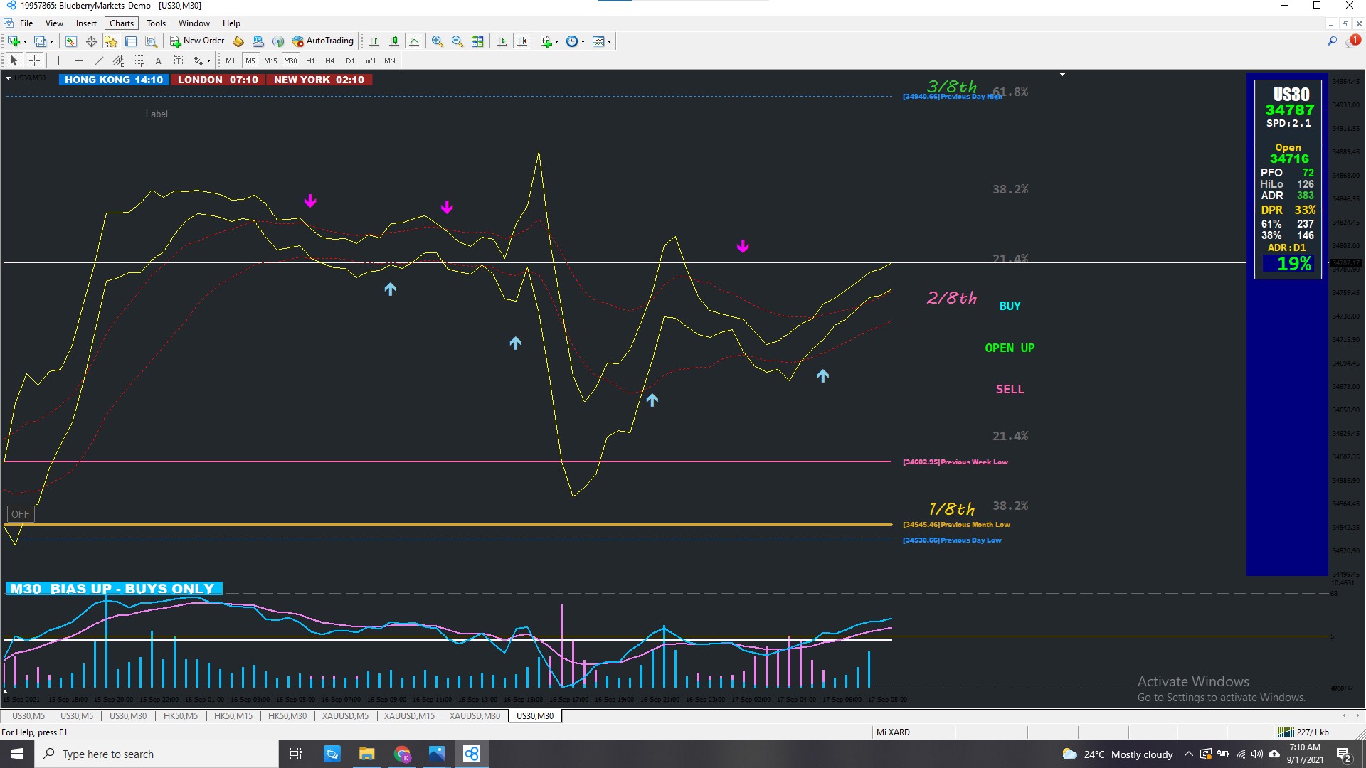 actually recalculates. The settings are (9, 36, 144), the instrument is US30, TF = 15M.