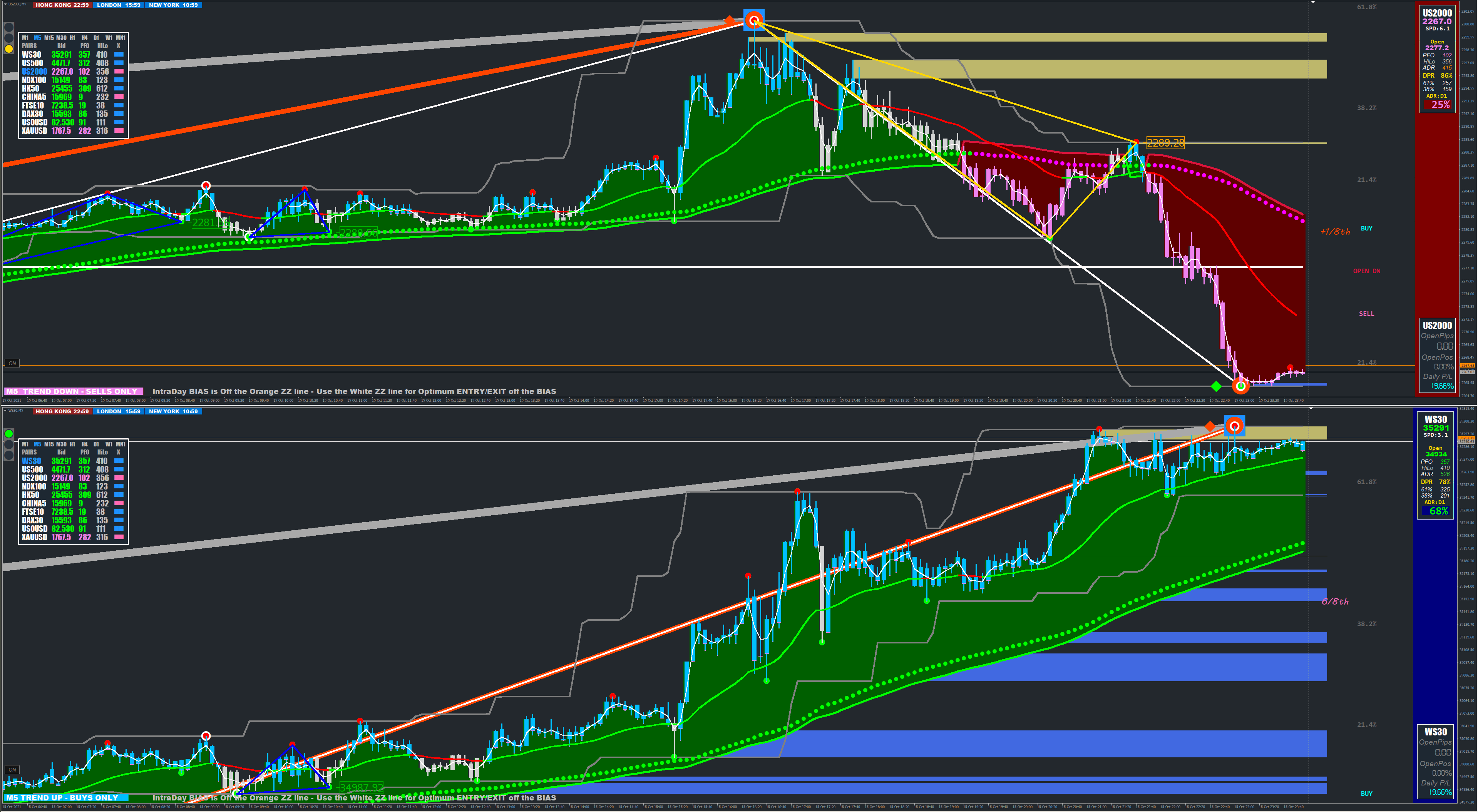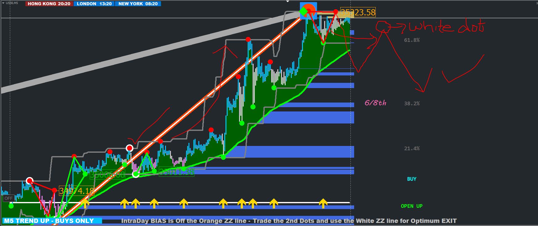 Final confirmation you need for a buy is at the close of a blue candle and VQ in the sub window turning blue. With all five of these expect an up trend (usually, nothing is perfect) and a significant move up. Exit when the white ZZ turns up.