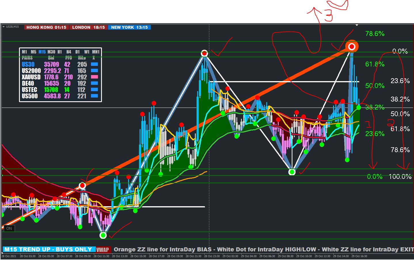 edandy wrote: Fri Oct 29, 2021 11:28 pm Use the Orange ZZ line as your Intra-Day BIAS - Use the White Dot as your IntraDay HIGH/LOW - Use the White ZZ line for IntraDay EXIT - After a new Orange ZZ line appears, WAIT! for price to cross the Trend line to confirm a change in the Trend Cycle.