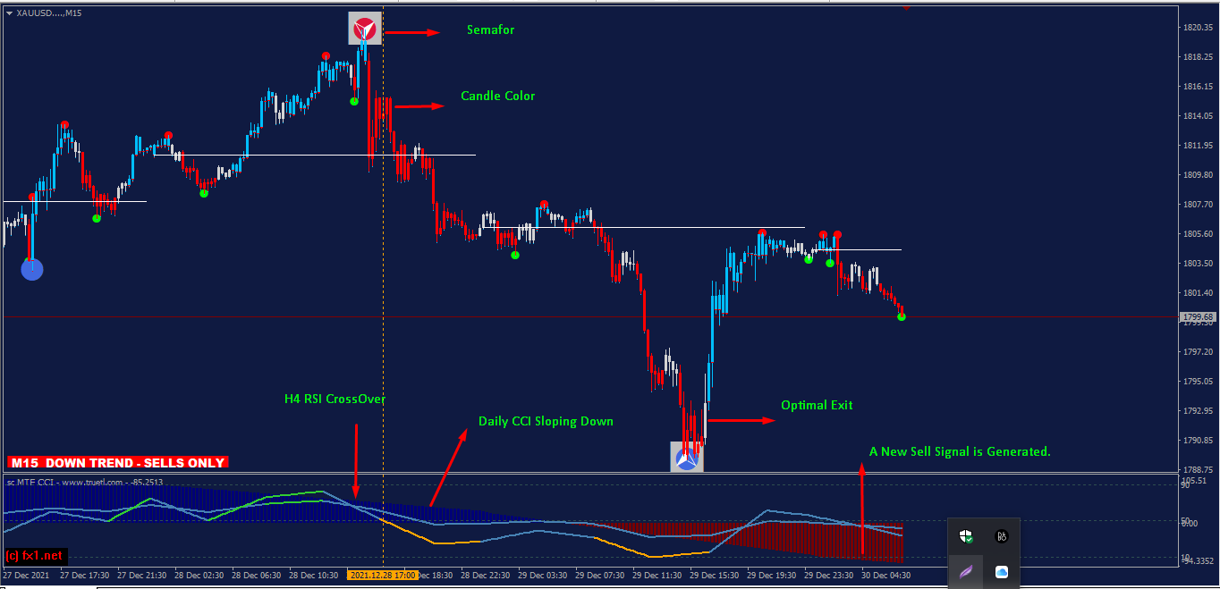 Mustafa wrote: Thu Dec 30, 2021 4:32 pm I think a little explanation of the parameters is warranted. The system is optimized for Trading on M15. Don't try forcing lower or higher timeframes onto it, it might not work optimally.... Xard's semafors are an outstanding stand alone system. However, I felt that it does not incorporate timeframes higher than 1 hour in a significant way. At the same time the boxes forming again and again as the markets keep making new highs or lows caused uncertainty whether a position could be entered or not.... So I included RSI 3 and 9 in MTF mode from H4. The 4H crosses of the two RSI is itself a very strong trade signal. The concept comes from Cristina Ciurea (Scientific Forex) which is based on 5 and 14 RSI crossover trade signal on 4H. For faster signals on lower timeframe I reduced it to 3 and 9. For inclusion of daily timeframe to have a clearer view of the bigger picture, I included Daily CCI in MTF mode with setting of 5. CCI usually has settings above 14. But for our purpose to detect change in market sentiment on M15 a lower number works really well... So 5 seemed optimal after quite a few trials...... The below screenshot shows recent price action on gold with the indicators....