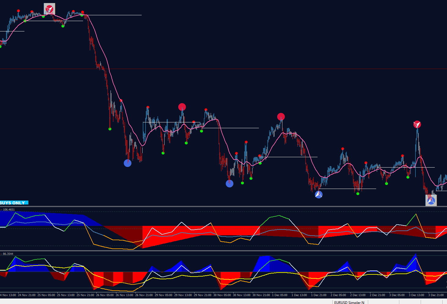 So I included RSI 3 and 9 in MTF mode from H4. The 4H crosses of the two RSI is itself a very strong trade signal. The concept comes from Cristina Ciurea (Scientific Forex) which is based on 5 and 14 RSI crossover trade signal on 4H. For faster signals on lower timeframe I reduced it to 3 and 9. For inclusion of daily timeframe to have a clearer view of the bigger picture, I included Daily CCI in MTF mode with setting of 5.