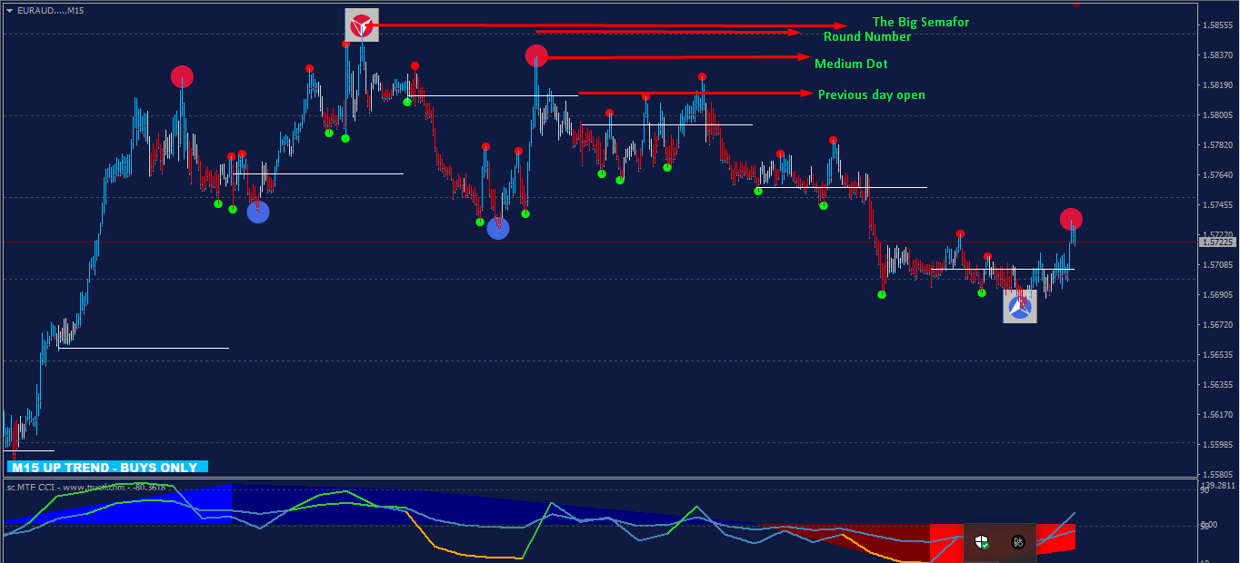 This is discretionary system... So trade it with open eyes and open mind...... semafor dots repaints so whenever you want to trade any big dot or square, first let it be confirmed by CCI Slope/color and the RSI cross..... Then be willing to let it run.... and keep adding further trades as new small dots appear and further RSI crosses happen..... I hope you know enough about trading to observe the system more in depth and apply the money/risk management style that suits your purpose...... you can add your favorite indicator to the system and hope that adds more value to the system...... Let it be a marathon rather than a sprint..... wish you all the luck in the world and infinite patience to let your trades go free for weeks at least... Regards.