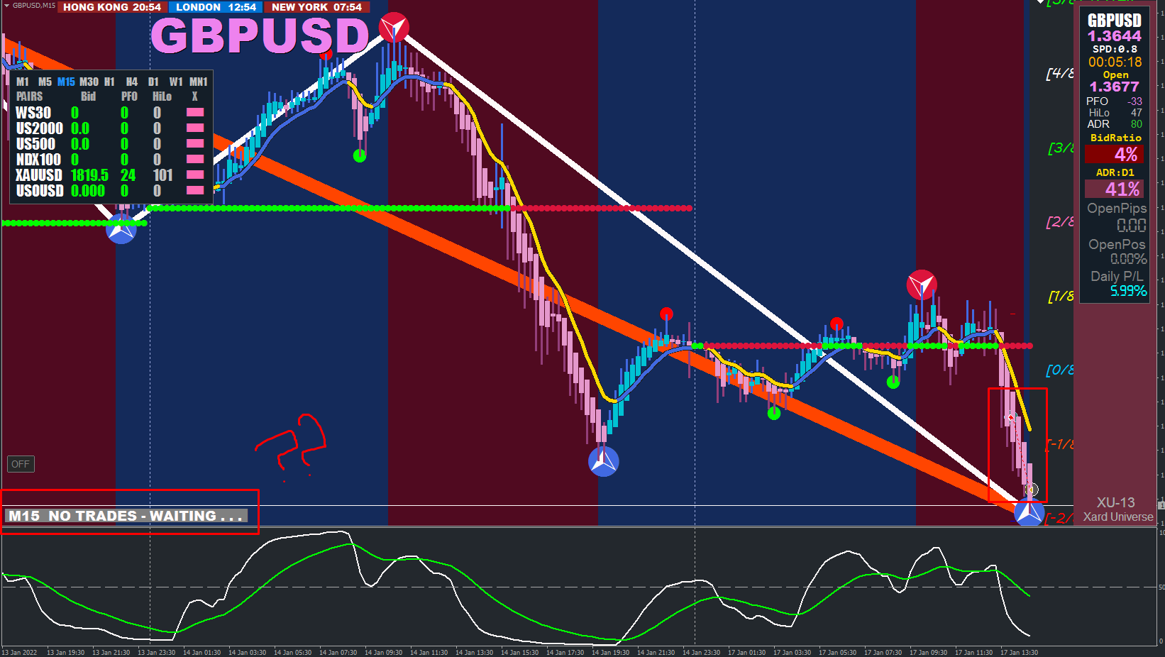9876It possibly shows wait because the blue arrow semafor has appeared signalling that things may turn upwards in a temporary pullback. So, caution needs to be exercised if you want to open new positions.Boobligoom wrote: Mon Jan 17, 2022 11:57 pm GU sale. I can't figure out why the sign in the left corner shows wait. even though the chart is going down?