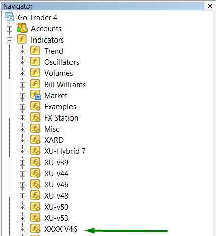 I trust you now have the XXXX V46/MQL4/Indicators/XXXX V46 folder loaded up properly